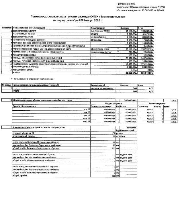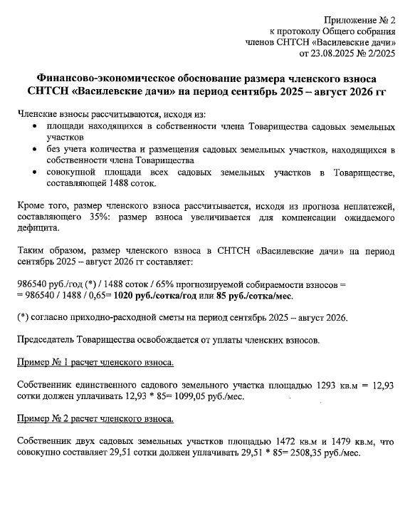Утверждена расходная смета на авг 2025 - сен 2026 и размер членского и пользовательского взноса 85 руб./сотка.